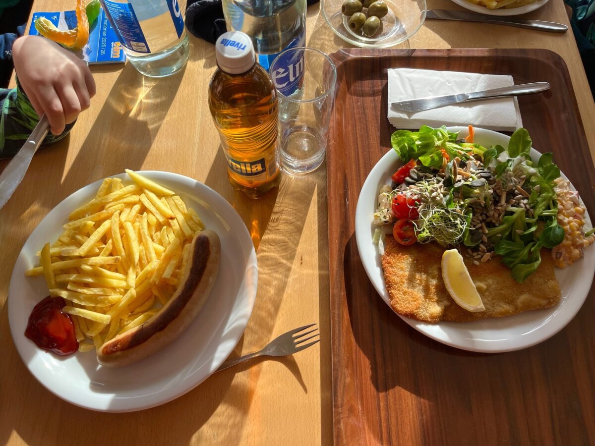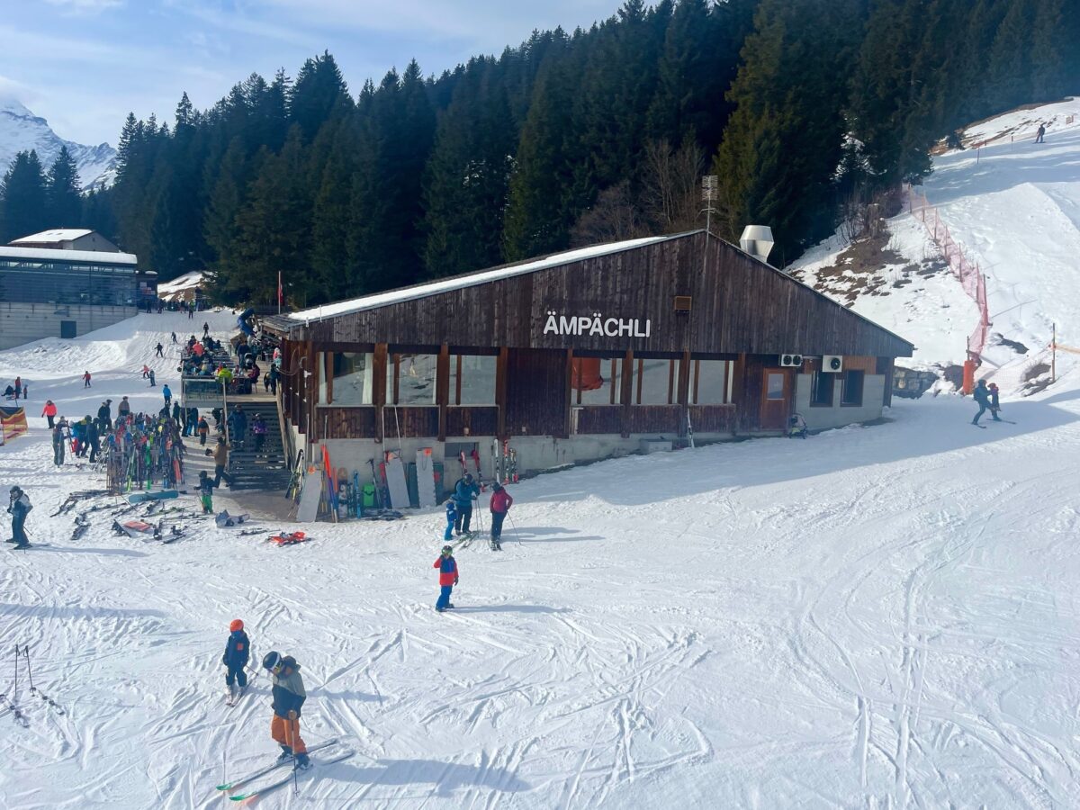 Für das Mittagessen begeben wir uns im Herzen des Skigebiets direkt neben der Kinder-Arena ins Ämpächli. Im Selbstbedienungs-Bergrestaurant findest du neben Skigebiets-Klassikern auch ein Salatbuffet. Passt das Wetter, kannst du auf der Terrasse die Sonne geniessen – wieder mit freiem Blick auf die Tschingelhörner.