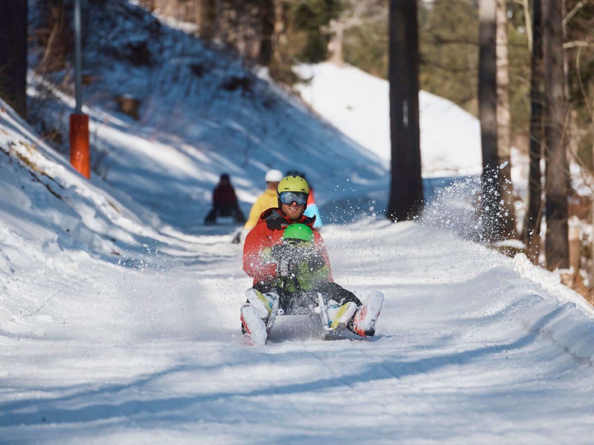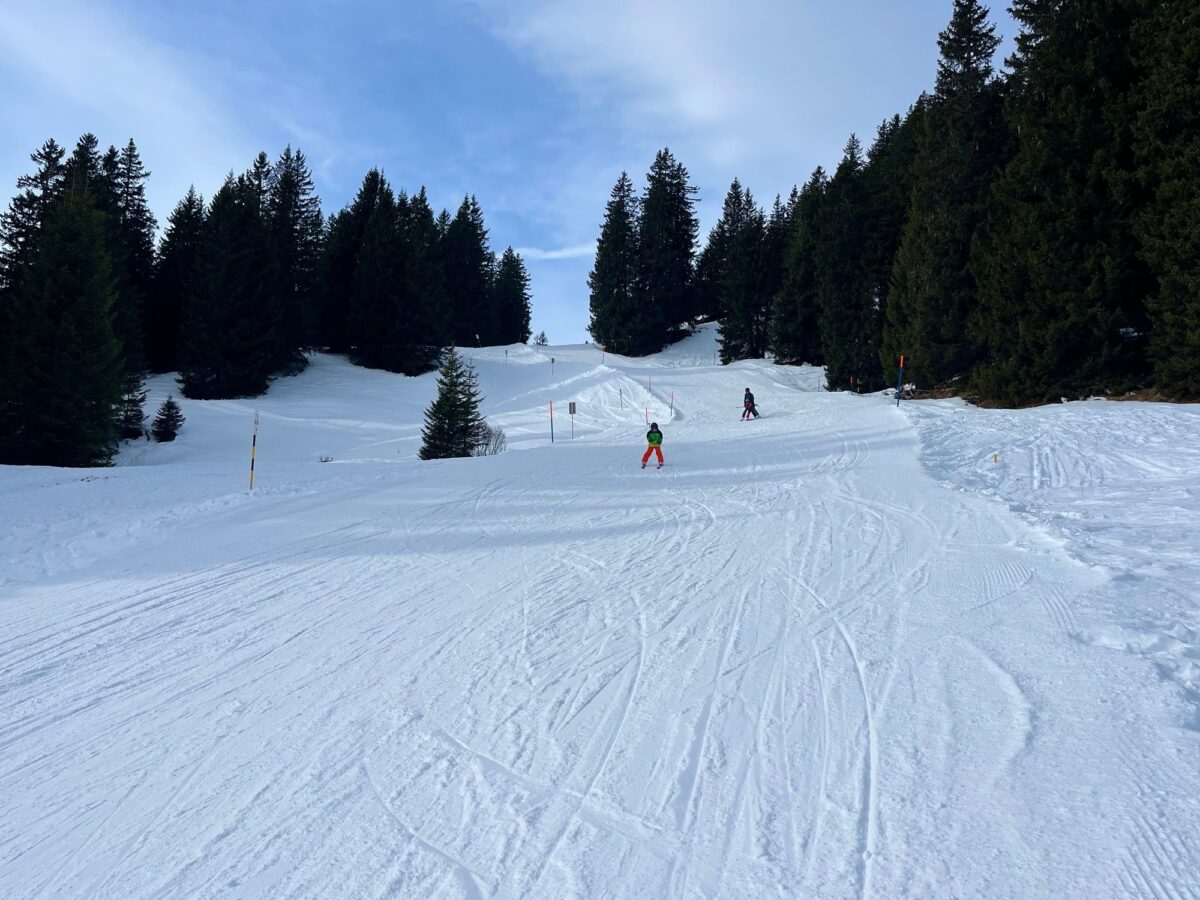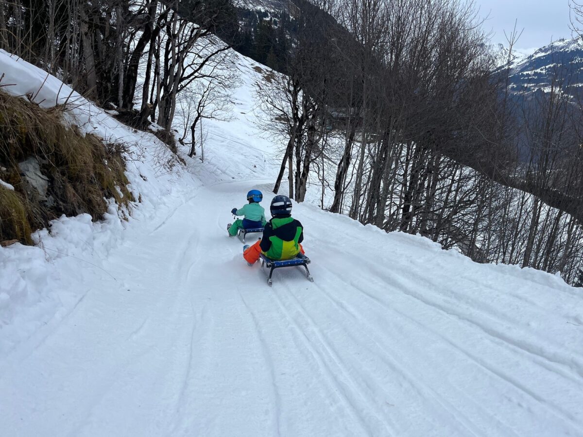 Ein unerwartetes Highlight folgt zum Abschluss des Tages. Vom Ämpächli kannst du auf der vier Kilometer langen Schlittelbahn hinunter zur Talstation sausen. Die Schlitten dafür mieten wir direkt bei der Bergstation der Gondel und können unsere Skis mit der Bahn runter schicken, wo sie bei der Talstation danach schon auf uns warten. Die Skischuhe eignen sich gut, um den Schlitten zu steuern. Unsere Jungs waren erst etwas skeptisch, ob sie die Schlitten beherrschen werden und wollten bei der ersten Fahrt nur mit einem Erwachsenen auf das Gefährt. Doch schon nach wenigen Metern waren die Zweifel verflogen. Logisch, dass wir noch eine zweite Fahrt anhängten – dieses Mal jeder mit dem eigenen Schlitten. Ein perfekter Abschluss eines wunderbaren Wintersporttages. Und das alles weniger als 90 Minuten von Zürich entfernt.