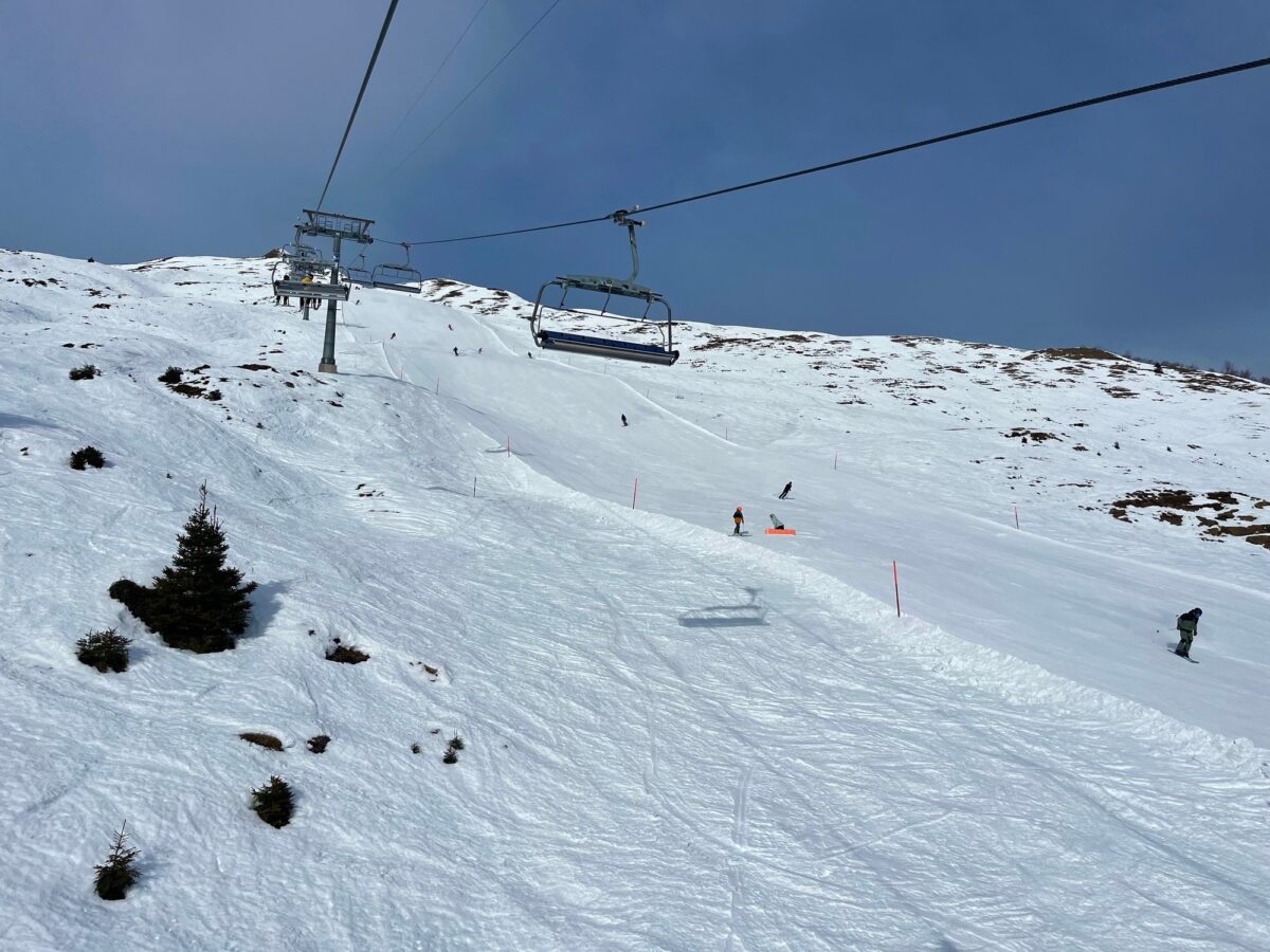 Doch vom herrlichen Ausblick in die Bergwelt zurück auf die Skipisten. Der Start beim Schabell oben erinnert an eine kleine Bühne. Über eine steile Kante (je weiter links desto flacher) kommst du auf die Piste – ein super Start. Rechts führt die blaue Piste ins Tal; links kommen auch ambitionierte Skifahrer auf der legendären Vreini-Schneider-Piste auf ihre Kosten.
