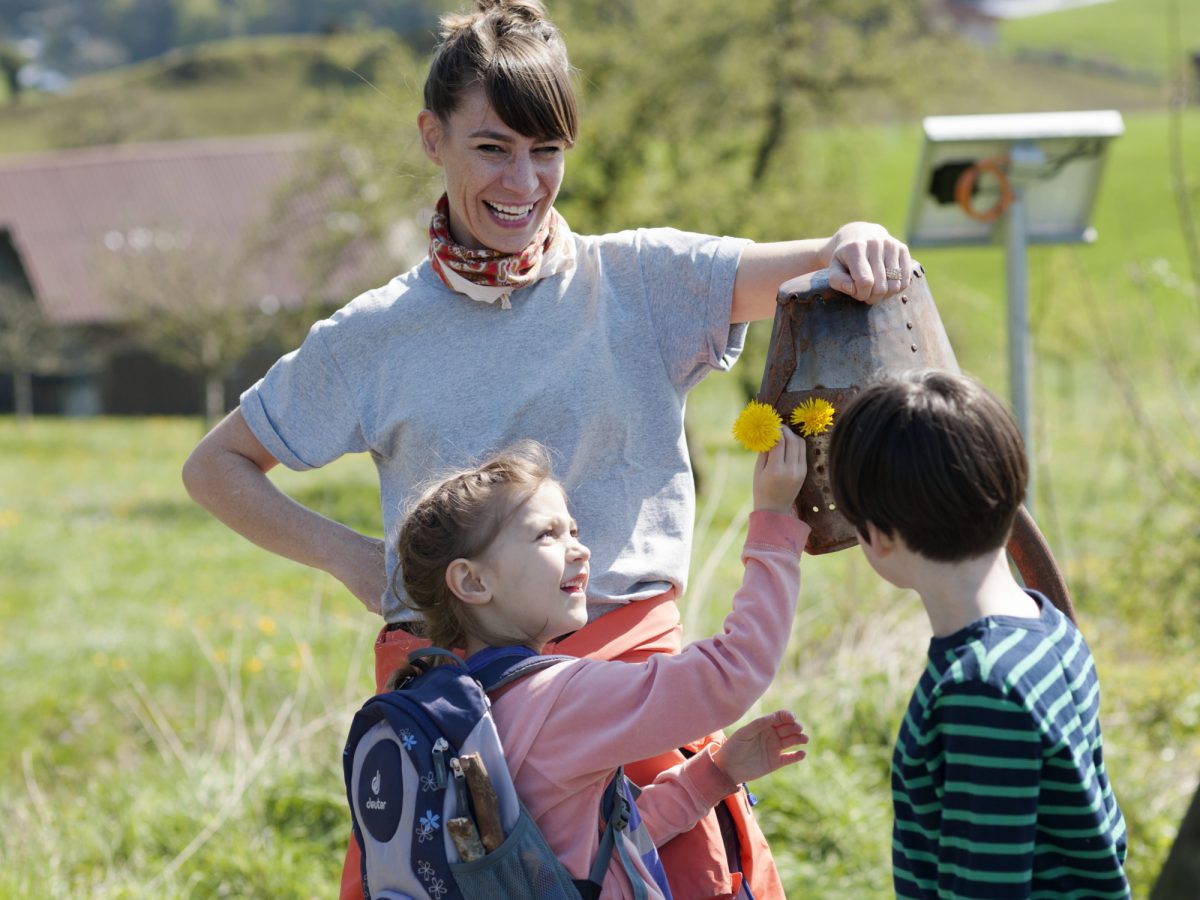 Geschichten am Wegesrand: Auf dem 3,5 km langen Rundweg machen zehn QR-Stationen den Spaziergang zum Hörabenteuer. Kinder von 3 bis 10 Jahre lauschen lokalen Sagen und Naturgeschichten auf Schweizerdeutsch.
